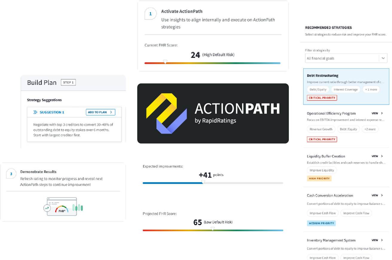 ActionPath is a structured, data-backed improvement framework designed to elevate supplier financial performance. It translates financial risk insights into prioritized, practical actions tied directly to the financial drivers that influence a company’s rating.Rather than stopping at risk identification, ActionPath creates forward momentum, aligning enterprises and suppliers around measurable financial improvement.
